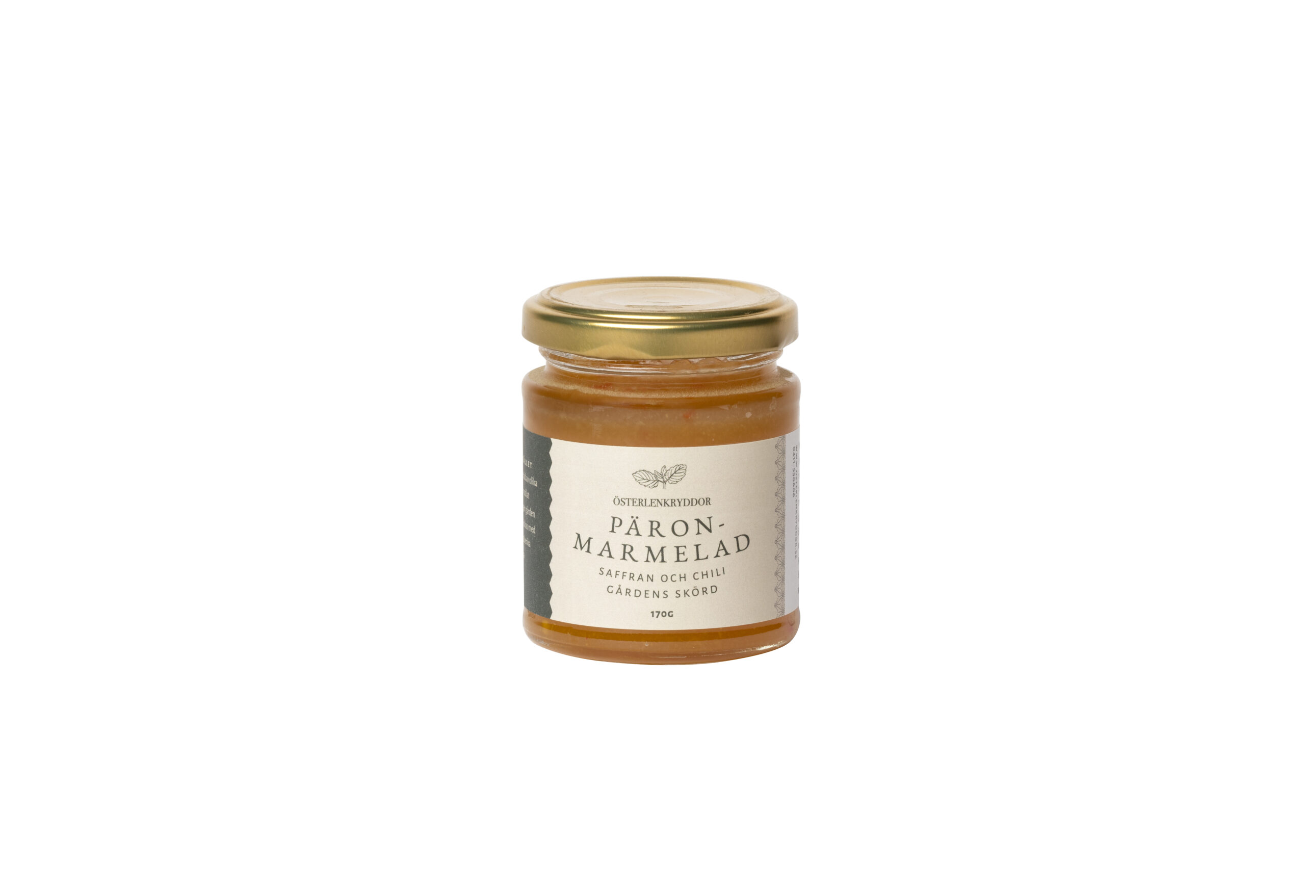 Ingredienser: Päron(45%), socker, chili, förtjockningsmedel (pektin), citronjuice, saffran, konserveringsmedel(natriumbensoat) salt.